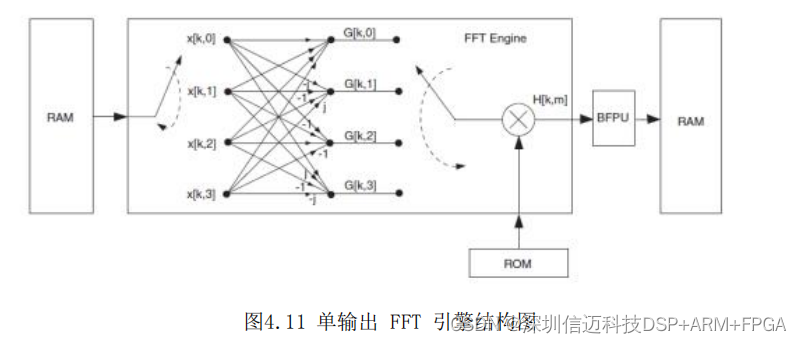 4.11 所示,FFT 引擎通过并行方式从 RAM 中读取复数输入x[k,i],然后通过蝶形运算得到