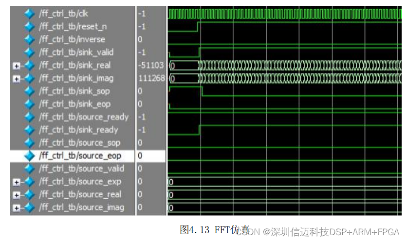 模块提供信号激励。FFT数据输入输出时序如图 4.12 所示,仿真图如4.13所示,左侧为
