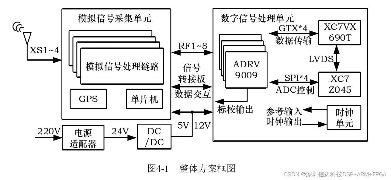 数字信号处理单元内置1片XC7Z045和1片XC7VX690T提供电路控制和数 字信号处理能力。信号转接板主要完成模拟信号采集单元、数字信号处理单元和 电源模块之间的供电连接以及信号互联与功能拓展。电源模块实现交流220V到直 流24V的转化,并通过DCDC+LDO模式为各单元供电。