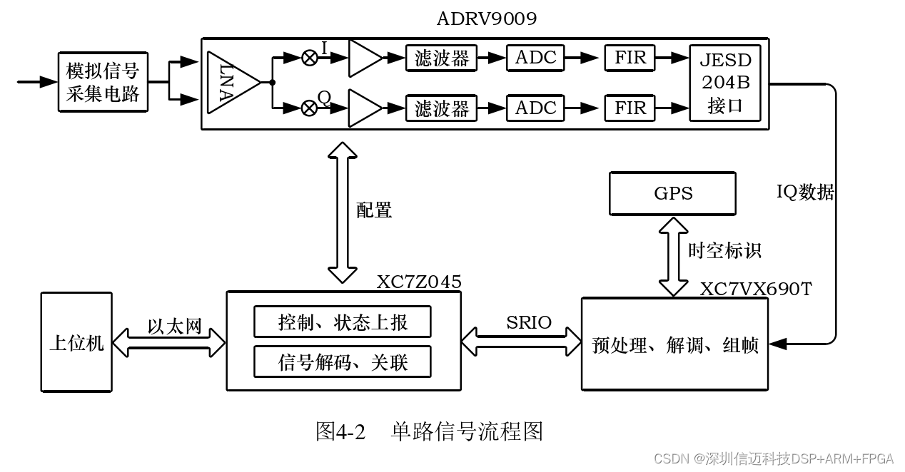 XC7Z045为整个接收链路的控制中枢,完成对模拟信号采集单元及数字信号 处理单元的控制,调节输入通道 滤波器 的带宽,调节增益模式及增益大小,调节 ADRV9009本振的输出,调节各级采样率等。
