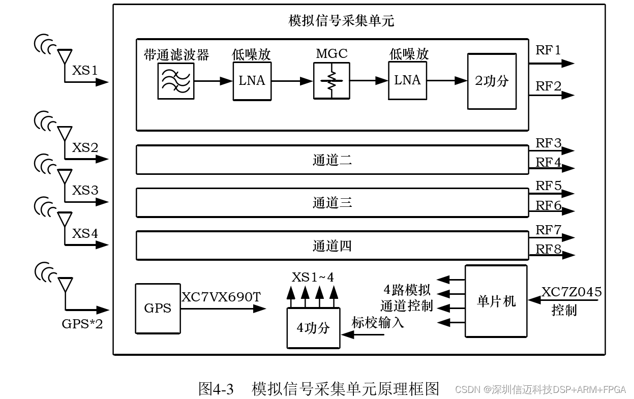 模拟信号采集单元是对4路模拟信号预选,提供滤波、增益和耦合校正功能, 随后功分为8路模拟信号,馈入数字信号处理单元。内部集成GPS接收机,为输 出的数据打上时标,同时实现定位和寻北功能,单片机实现对模拟信号处理芯片 的配置。通过转接板与数字信号处理单元互联,实现XC7Z045对单片机的控制与 XC7VX690T对GPS信号的分析。 4.2.2 模拟信号采集电路设计