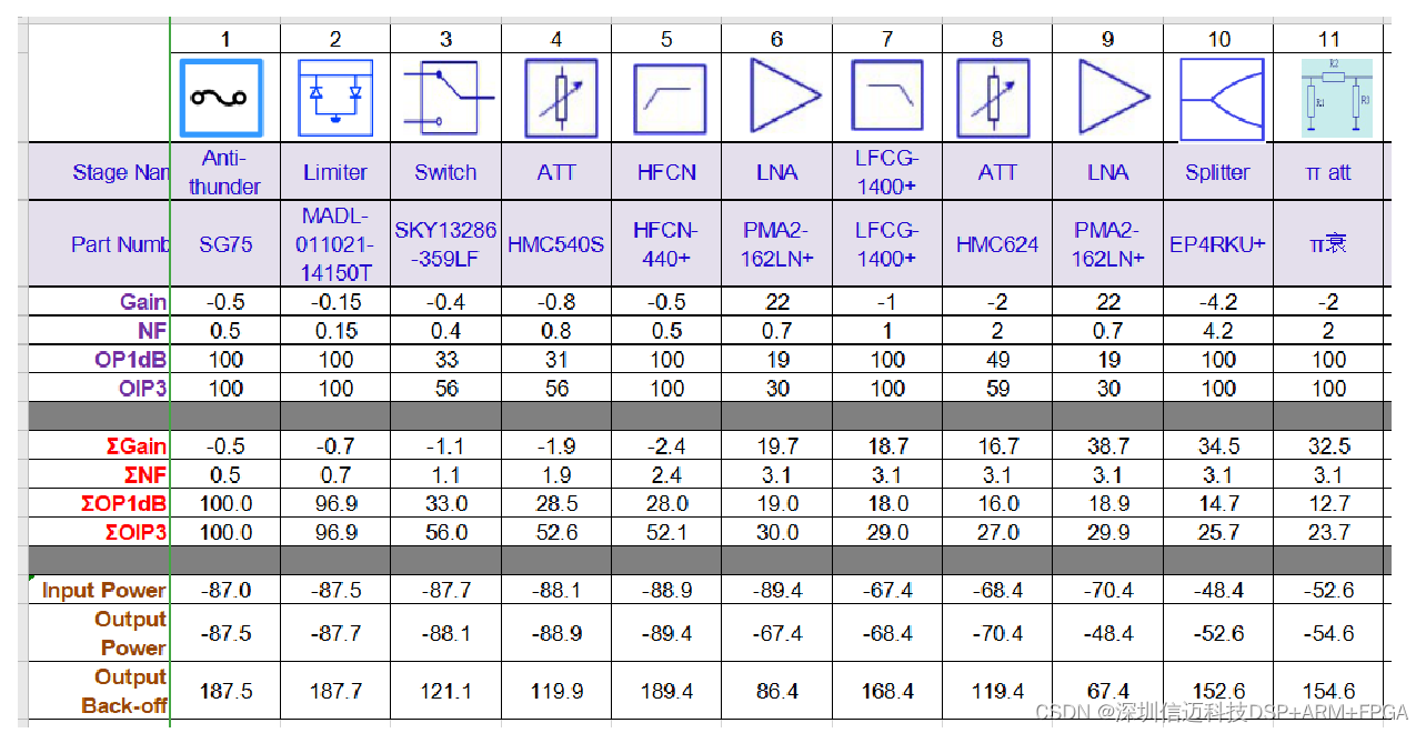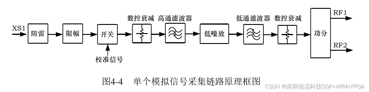 模拟信号采集电路包含4路调理通道,主要实现4路700MHz-1600MHz频段 信号的接收,单个模拟信号链路原理框图如图4-4所示。
