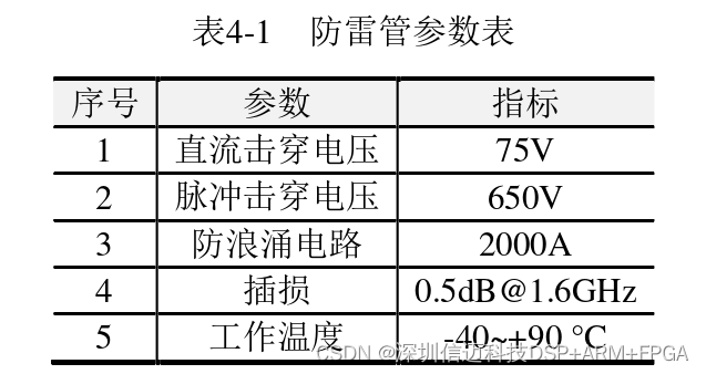 从表4-1可以看出,放电管可以承受650V的脉冲电压和2000A瞬时电流。输 入插损在1.6GHz时为0.5dB。