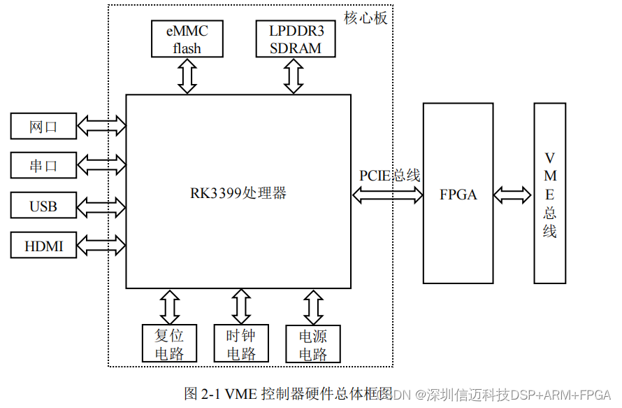 硬件总体包括 RK3399 处理器最小系统(信迈RK3399核心板)、控制器接口、VME 总线接口三个部 分。RK3399 最小系统主要包括电源、时钟、复位以及存储电路。控制器接口主要