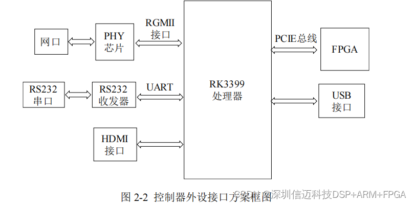 总体框图如图 2-1 所示。整个嵌入式控制器以 RK3399 处理器为核心,同时有搭配