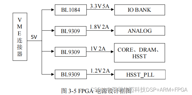 用 3.3V,HSST 高速串行接口的模拟电源需要 1V 和 1.2V。FPGA 电源设计框图如
