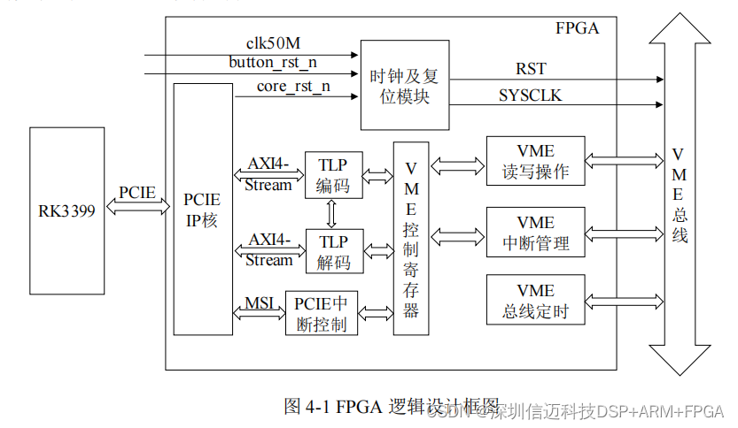 4-1 所示,主要包括 PCIE 接口逻辑和 VME 接口逻辑两大部分。在 FPGA 内部设