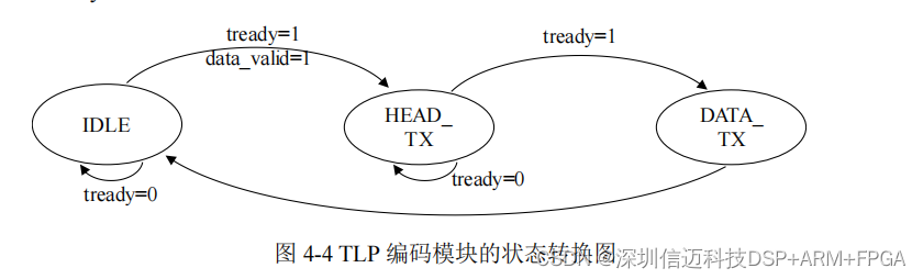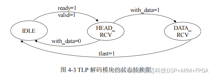 TLP 解码状态机包括 IDLE、HEAD_RCV、DATA_RCV 三个状态。其中,初