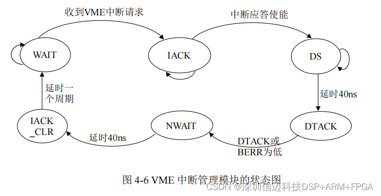 VME 中断模块的状态转换图见图 4-6。初始状态为 WAIT 状态,当接收到 VME