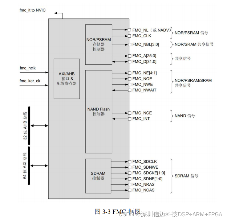 FMC)。其具体的功能框图如图 3-3 所示,包含了常用的存储芯片的控制器。控制器