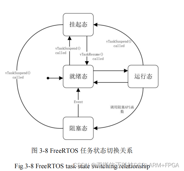 FreeRTOS 中的任务状态永远处于下图中四种状态中的的其中一种,其切换关系如图