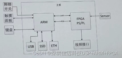 ARM搭载 Linux系统工作, Linux 系统裁多余的部分使系统启动时间最优化。ARM与FPGA之前通过 PCIE 接口传输视频流。ARM 系统可以对从 FPGA 传过来的实时视频流进行存图或者录像操作,回放时,ARM 系统保存的图像反传到FPGA进行处理后显示。