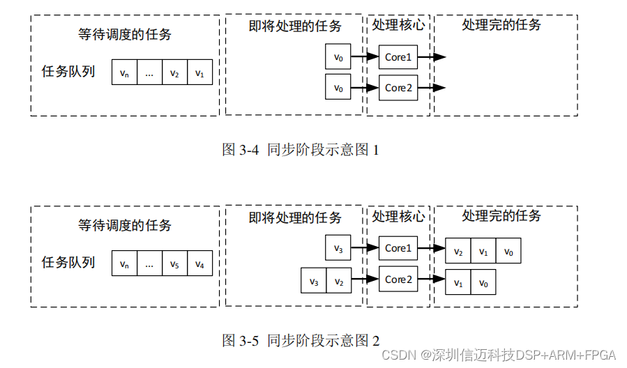 所以根据同步机制,此时应该进行一次同步,Core2 放弃执行任务 v2,如图3-6所