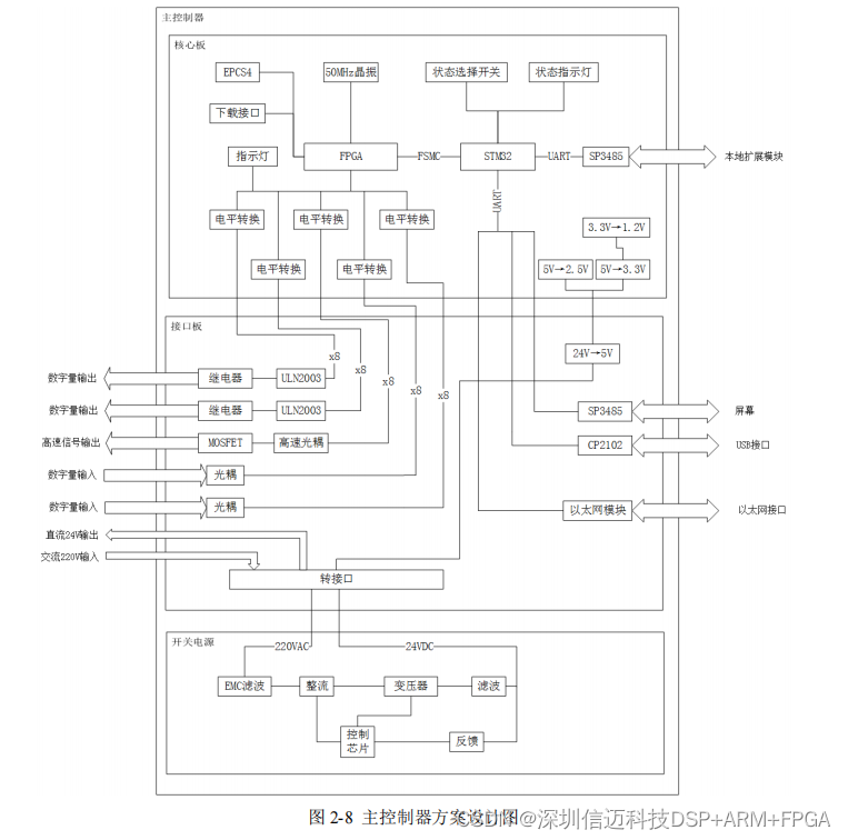 主控制器的总体方案设计如图 2-8 所示,分为核心板、接口板、开关电源。