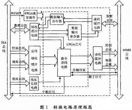 如图1所示,转换电路由FPGA芯片EPF10K30-RI208-4、FPGA配置器件EPC2LI20、接收缓冲电路、地址比较电路和总线接收电路组成。工作原理如下:当转换电路工作时,首先根据FPGA配置器件内的文件对FPGA芯片进行自动配置,当ISA总线相应地址位与6位拨动开关值匹配时(拨动开关为预设待转数据模块地址),选中需要转换数据的地址,然后由ISA数据总线发送数据或命令,FPGA芯片中的译码电路结合地址总线信号和控制总线信号将控制数据转为MMи总线对后级程控模块的控制指令,对后级模块实现控制。