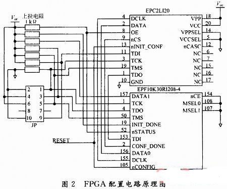FPGA配置器件电路如图2所示,EPC2LI20为配置芯片,工作电压5 V或3.3 V,支持在系统编程(ISP)和菊花链配置,可重复编程;EPF10K 30R1208-4为Altera公司生产FPGA芯片,工作电压为5 V,包含逻辑单元1 728个,存储位数12 288位;JP为通过QuartusⅡ软件对配置芯片进行程序烧写接口。