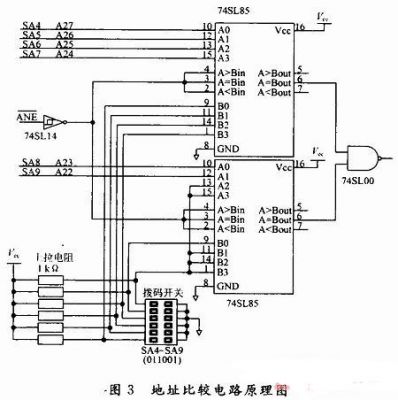 地址比较电路如图3所示。74SL14为带滞环比较的反向缓冲器,74SL85为4位数字比较器,6位的拨码开关为预存待转数据程控模块地址,74SL00为反向缓冲器。拨码开关共有6位,每1位都可以是逻辑高电平“1”或是逻辑低电平“0”,故该拨码开关共有26个组合,可以代表26个程控模块的地址。如图3所示,拨码开关为011001,代表将要进行转换的数据来自地址为011001的程控模块,当控制信号给定的地址A27~A22与011001相符时,74SL00输出低电平,该低电平与ISA总线的读控制信号IOR和写控制信号IOW#一起构成FPGA从ISA总线读数据或向ISA总线写数据控制信号。