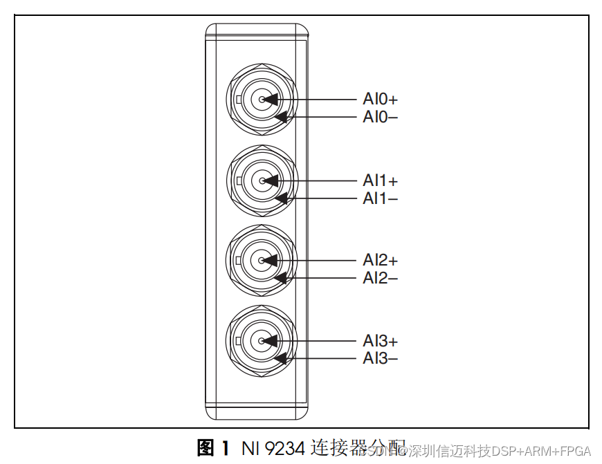 NI 9234 共有四个 BNC 连接器,可提供四路同步采样模拟输