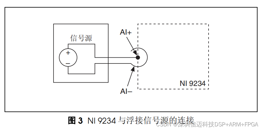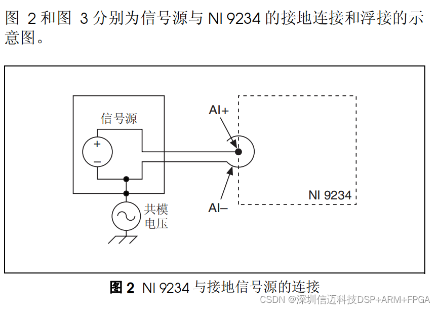如信号源与 NI 9234 之间为接地连接,需确保 AI– 外壳上的