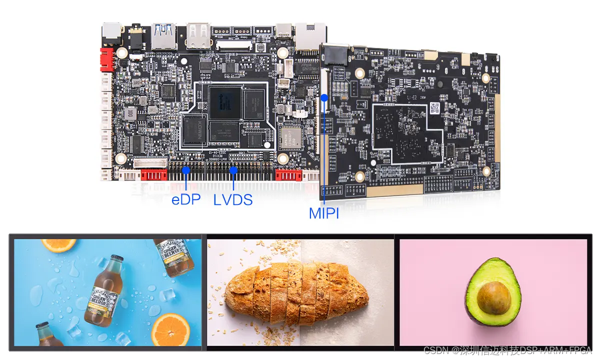 支持LVDS/eDP/MIPI输出,其中LVDS屏最大支持1920*1200的分辨率,eDP屏最大支持3840*2160的分辨率,MIPI屏最大支持1920*1200的分辨率,可支持三屏异显;
