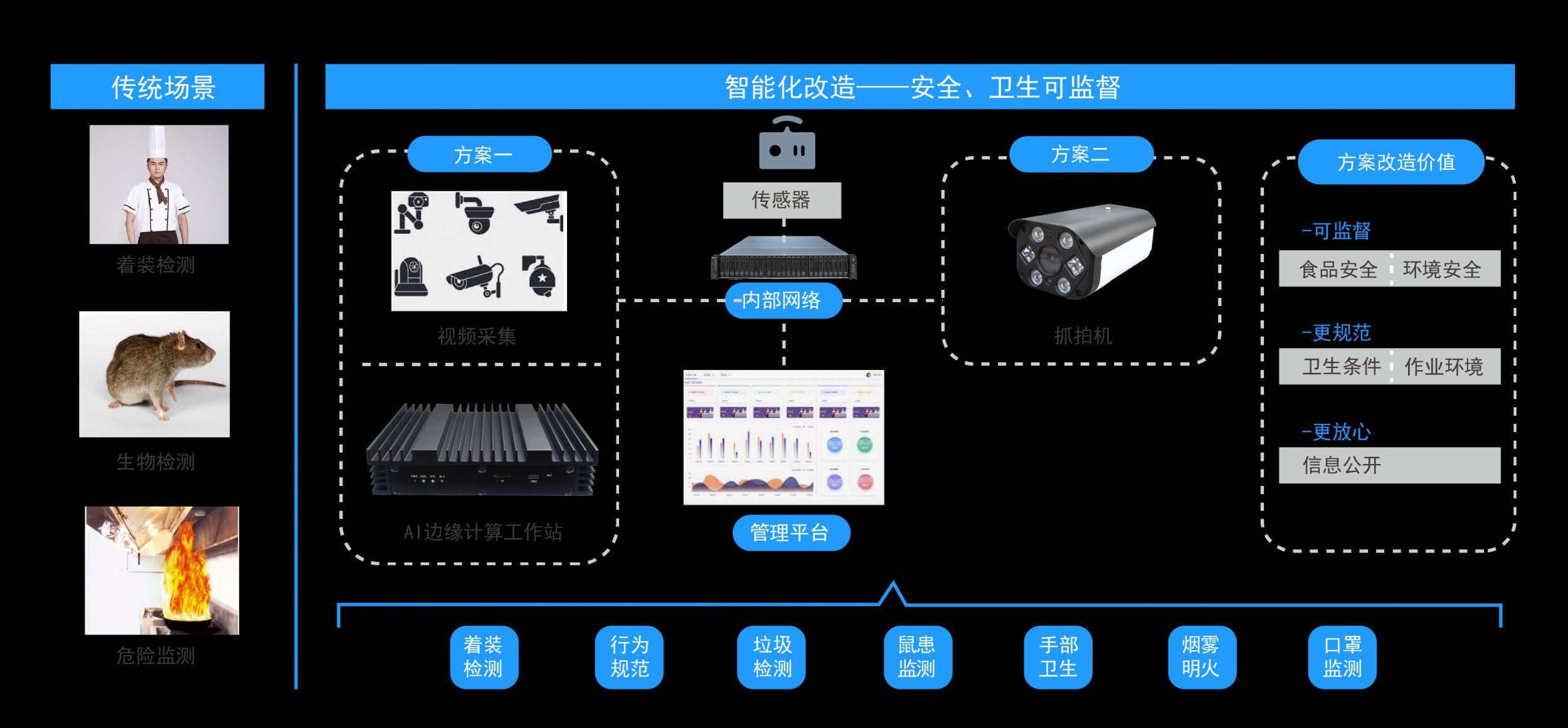 明厨亮灶 方案解决了餐饮企业顾客可以直观地看到后厨员工的操作是否规范,卫生是否合格,是否有一些不应该出现的物品,同时明厨亮灶是对餐饮企业员工的一种监督。 英码明厨亮灶方案可为企业和消费者提供后厨“透明化”技术支撑,使内外部人员实现“可见”,“可闻”,“可监督”;为餐饮消费市场营造安全、卫生、可信的放心消费环境。