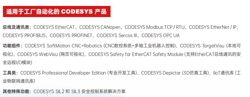 工业 控制系统 在现代制造和自动化领域扮演着关键角色, 基于IEC 61131-3 标准的控制器编程开发软件平台CODESYS,适用于多种行业的控制系统的开发,使用户方便快捷地对自动化工程进行编程和配置,完成项目开发、软件测试和应用调试。