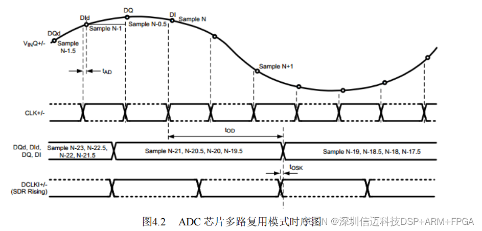 图中,CLK+/-是采样时钟信号,DQd,Did,DQ,DI 是 ADC 的数据线,DCLKI+/-
