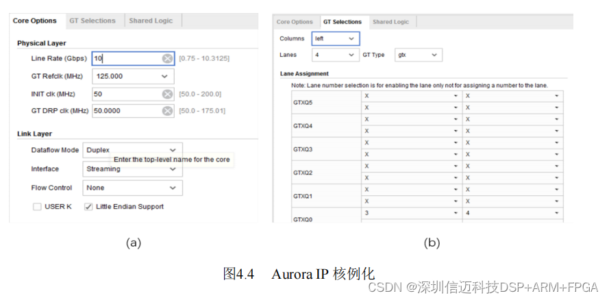 为 12bit;Aurora 模块是光纤子卡的驱动程序,采用 Aurora 协议,4 通道,单通道速