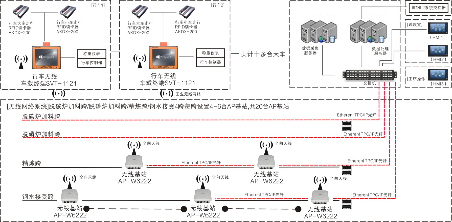 对炼钢连铸区域而言, 最重要的基础数据是铁水装入量, 废钢装入量, 出钢量, 浇下量, 通过天车物流系统采用计算机对天车称上的信号采集, 分析和处理, 保证数据的真实性和天车定位监控;方案需求
