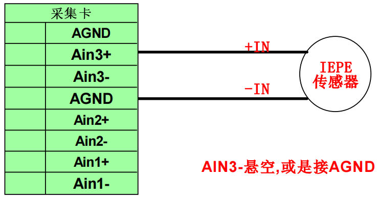 接IEPE传感器时,AGND作为输入负端,AIN+作为输入正端