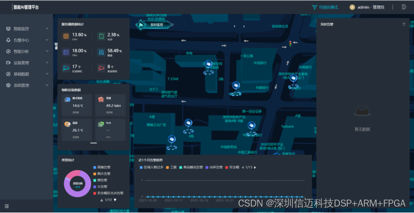 平台包含智能监控/告警中心/智能分析/设备管理/基础数据/系统管理等6大模块。
