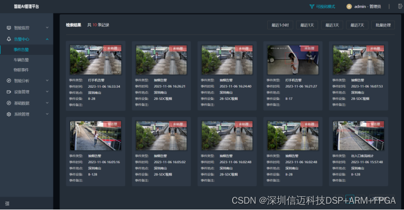 (支持人员结构化 / 人脸识别 / 车辆结构化 / 车牌识别 / 火焰检测 / 烟雾检测 / 抽烟检测 / 打电话检测 / 玩手机检测 / 未戴口罩检测 / 人员离岗检测/人员睡岗检测 / 人员摔倒检测 /人员静电消除 / 区域人数统计/区域人数不足/区域人数超员/区域人数异常 / 区域入侵检测 / 工服检测 /  安全帽检测 / 反光衣检测 / 电瓶车检测 / 规范停车(车辆违停) / 出入口客流统计 / 周界翻越入侵/人员越界检测/区域徘徊检测/ 消防车通道占用/消防逃生通道占用/垃圾未入桶检测 / 垃圾桶满溢检测 / 垃圾投放提示 /摄像头异常位移检测等算法)