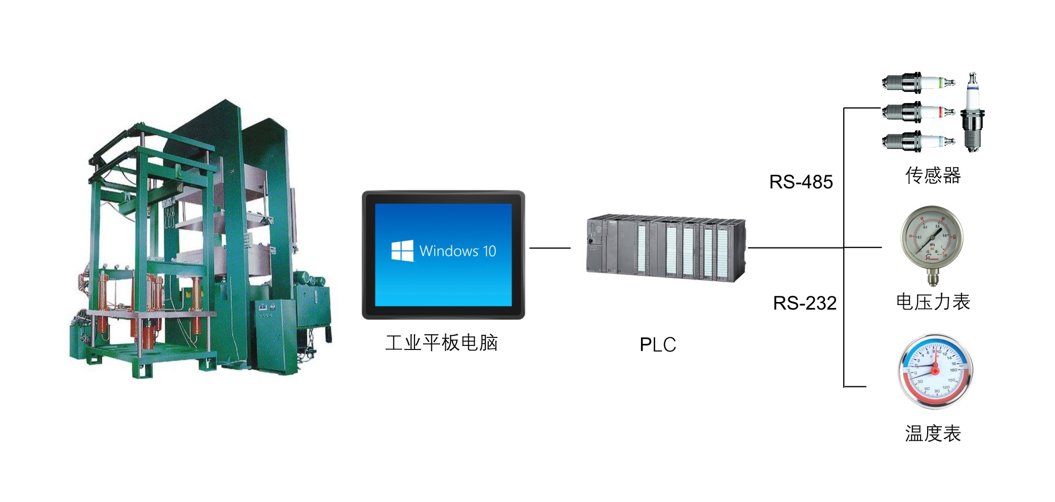DPC工业平板电脑作为上位机可完成所有的控制动作,监控硫化过程及设备状态,接收PLC获取的温度、压力等数据,使用者利用组态软件调整配方参数,实现轮胎硫化设备的智能管理控制,达到自动化生产的目的。