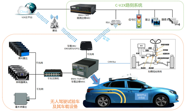 目前L4和L5级自动驾驶的车载计算单元MDC是采用CPU+GPU的双重架构方案,OBU通信器采用FPGA架构。MDC(BRAV-7520-WP)通过交换机连接车载激光雷达、毫米波雷达和摄像头等车载传感器,经过深度学习推理计算,进行数据结构化融合;同时直连OBU通讯器后,可实现向上接的C-V2X网络感知到路侧和云端信息,而向下是接的CAN总线。通过CAN bus连接车载线控系统,线控系统实现车辆的制动、转向、发动机启停、变速箱和车门窗控制,还有声音、图像和振动的警告系统的自动控制。为高度无人驾驶提供强大支撑!