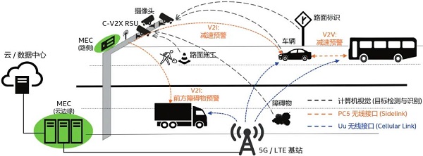 车辆自身会感知到车的状态信息,如速度、转角以及横滚,俯仰、航向等,还有路面环境感知,如激光雷达、摄像头、毫米波雷达和定位信息。C-V2X的路侧系统和云端平台能提供超视距功能——当车上了路,很难发现超传感器范围的信息,通过C-V2X设备会发送和接受相关信息,车会接收到前方交通的情况。