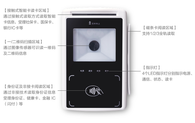 通过读取身份证、社保卡的信息,如姓名、身份证号、照片等,与人脸识别结果进行比对,确保身份的真实性;加密密码防止外接设备盗取密码;扫描一、二维码,如手机健康码、门票等;读取银行卡卡号。