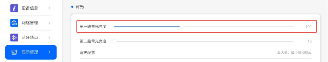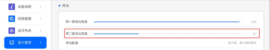 调节主屏幕背光亮度:拖动“第二路背光亮度”滑动条——调节至最左边,亮度最小——调节至最右边,亮度最大。