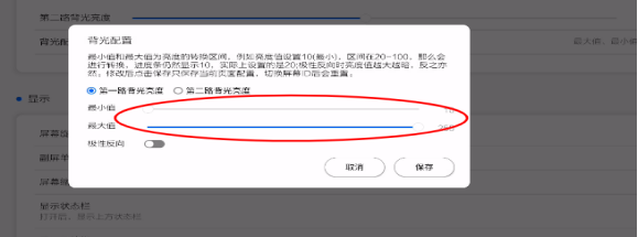 ②打开【背光配置】中的“极性反向”按钮 ,表示亮度调节范围与设置的亮度最大、最小值相反重启后设置成功;