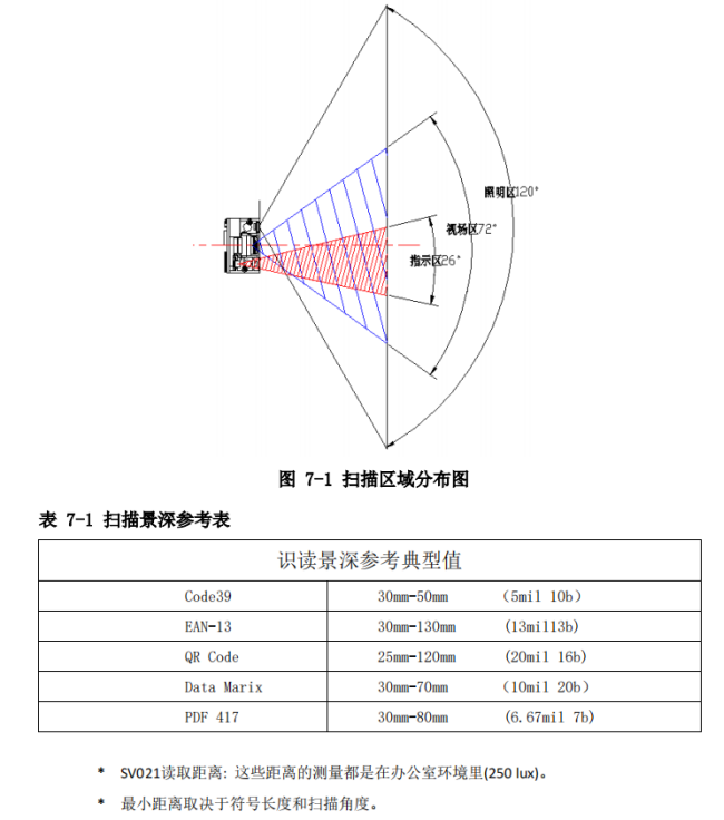 斜和俯仰角度的公差。扫描器在该区域使条码采集更加容易。
