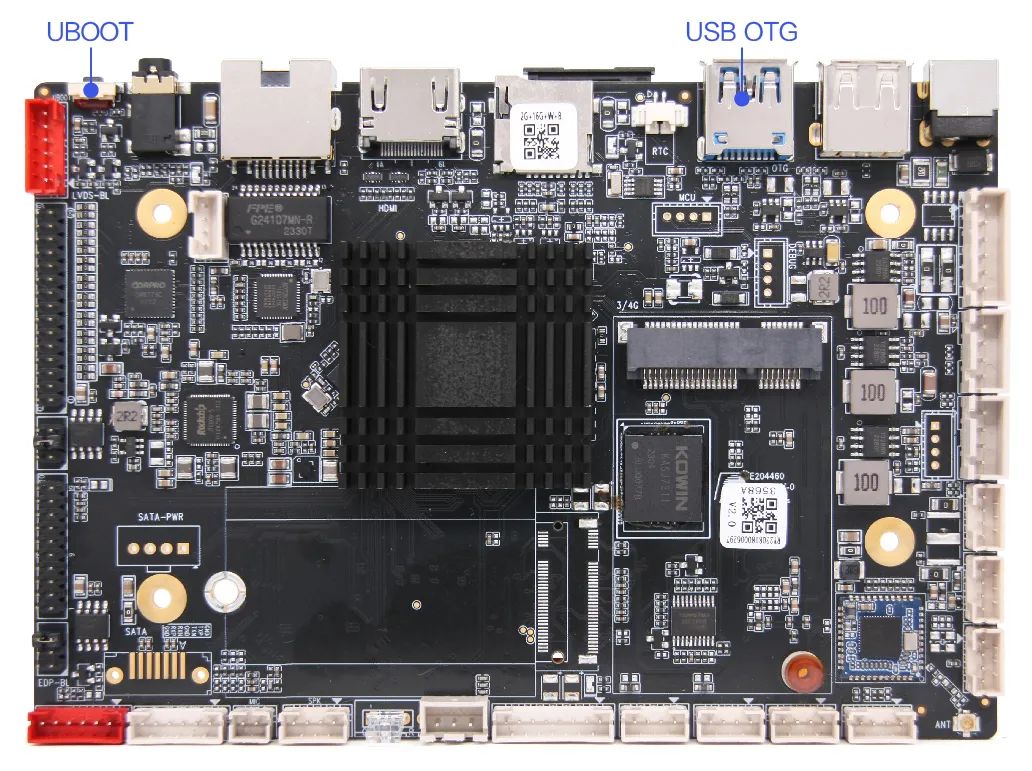 使用 USB 数据线,连接电脑和板卡的OTG口,按住 UBOOT 键,再通 12V 电源。