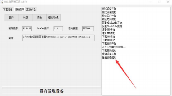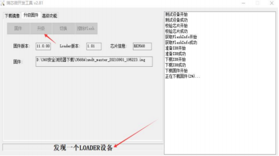 升级工具出现“发现一个 LOADER 设备”后,松开 uboot 键,点击擦除Flash,擦除成功后,会有弹窗,点击确定后,再点击‘升级’按钮。
