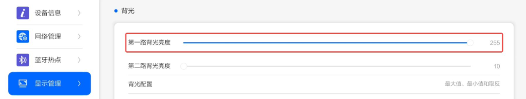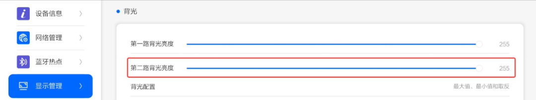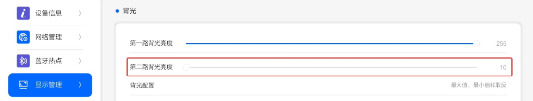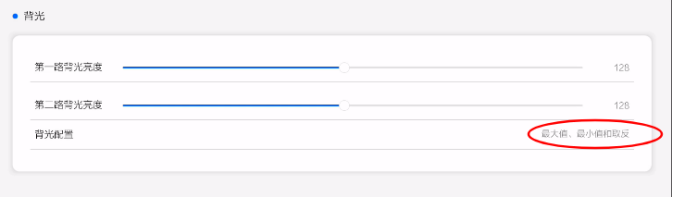 ②打开【背光配置】中的“极性反向”按钮 ,表示亮度调节范围与设置的亮度最大、最小值相反重启后设置成功;