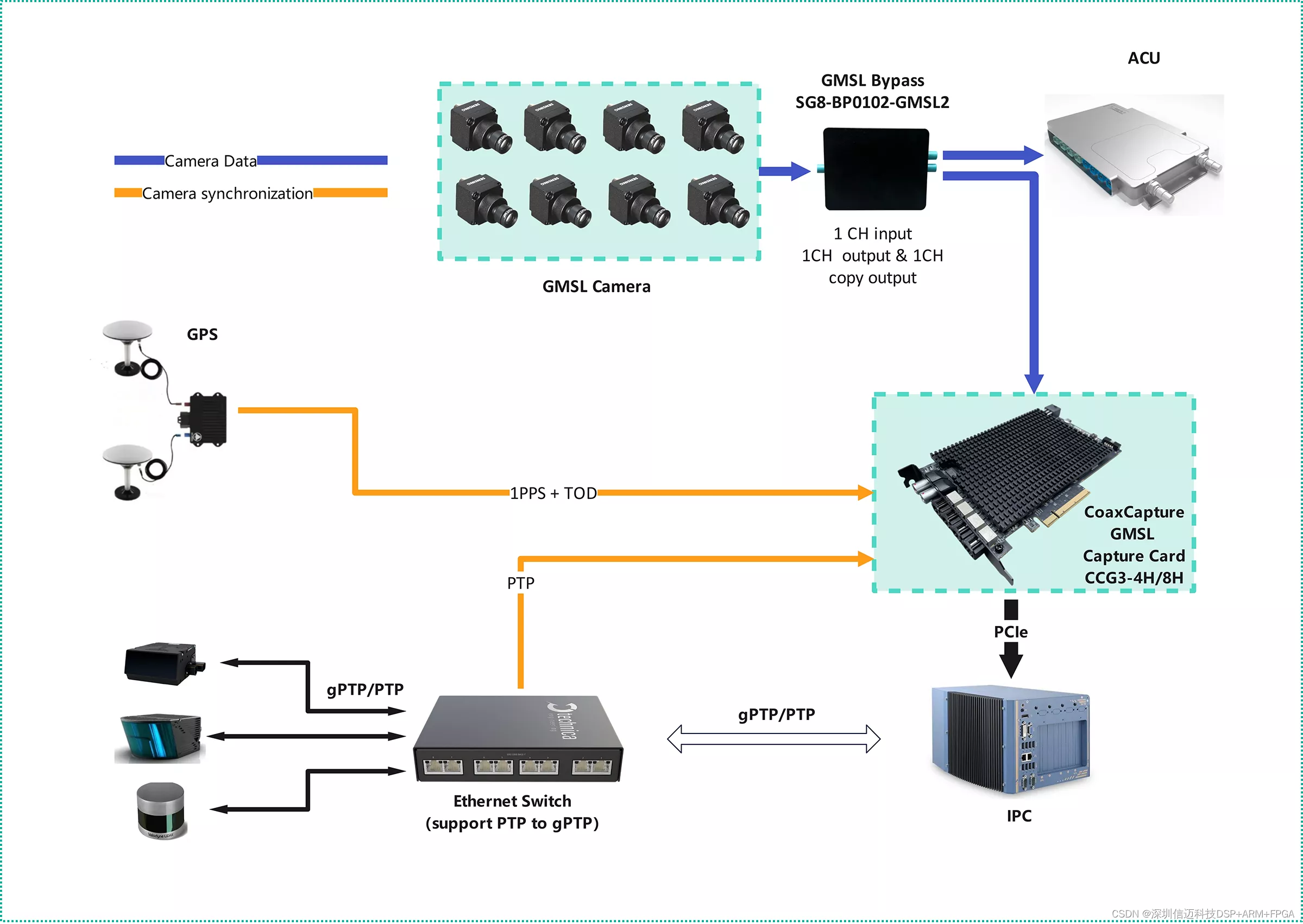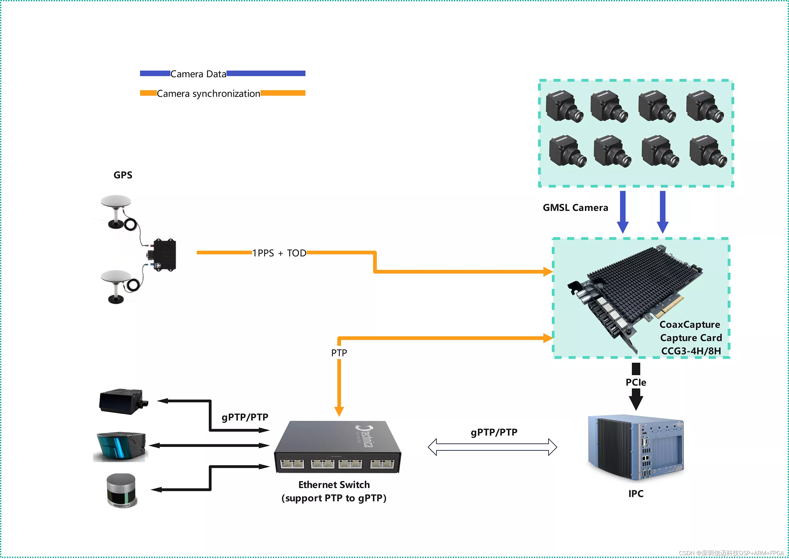 持8个GMSL摄像头输入,最大可支持800万像素30fps,同时可以连接GPS或者PTP进行授时。带有时间戳的数据可以通过PCIe Gen3接口,低延时无损的传输到工控机GPU进行处理。采用Liunx进行开发,基于X86架构,上手非常容易
