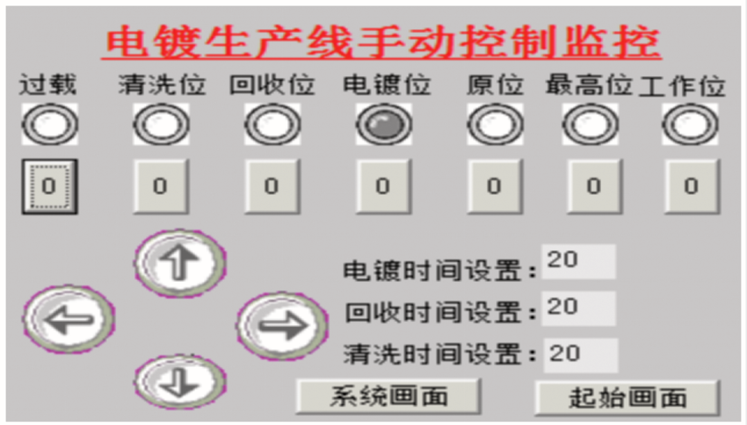 系统分为手动控制和自动控制两种方式,自动又分为单周期与连续控制,采用子程序编写,主程序完成系统初始化设置及子程序调用。电镀、回收、清洗的时间在触摸屏上根据工件不同和环境温度不同,进行设置、修改,达到最佳控制效果,保证了产品质量,提升了工作效率。