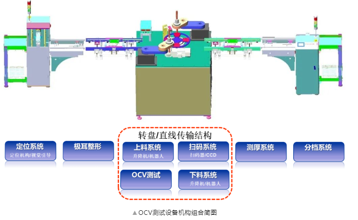 OCV(Open circuit voltage)测试设备处于锂电池化成封装段,可用于圆柱、软包、方壳动力等电池的检测。它的目的是检测电池的SOH(StateOfHealth),即电池的健康状态。通过对成品电池的OCV检测,即:开路电压、电池内阻和负极与壳体之间绝缘电压的测量与数据分析,判定电池的状态是否满足 性能指标 ,从而对电池分档,保证电池的综合性能。