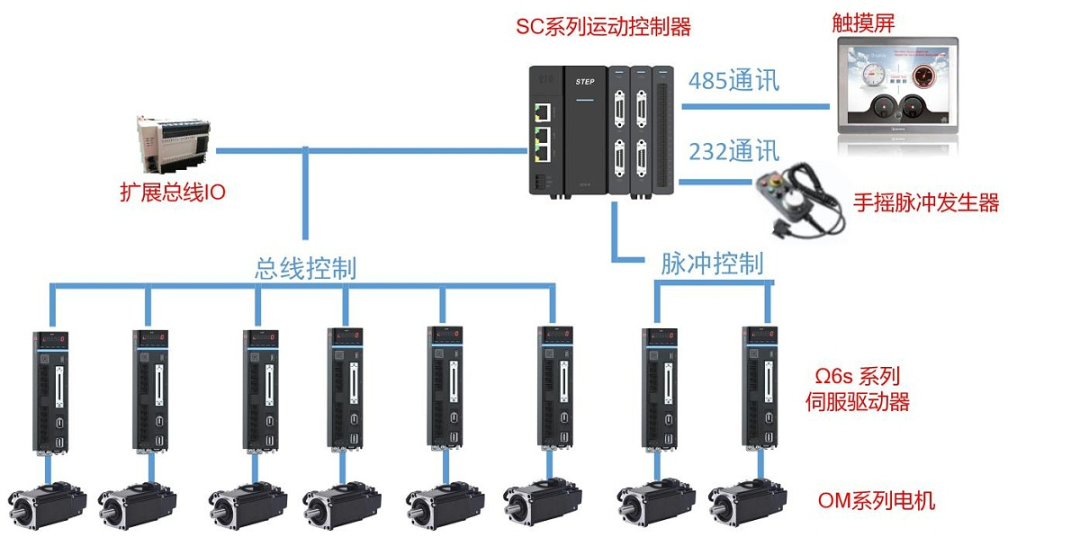 绕线机方案主要由运动控制器、伺服驱动器、伺服电机、HMI、扩展IO、手摇脉冲发生器等组成,系统拓扑如下所示: