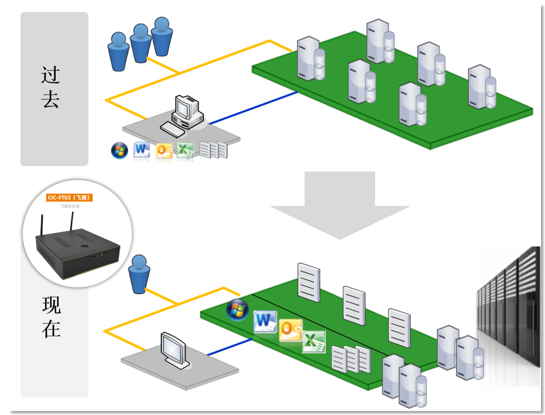 • **降本增效,绿色节能:**云终端桌面部署周期缩短80%以上、节省运维成本40%以上。并且整机功耗低、无污染、无噪音,可节省64%以上的电力消耗。