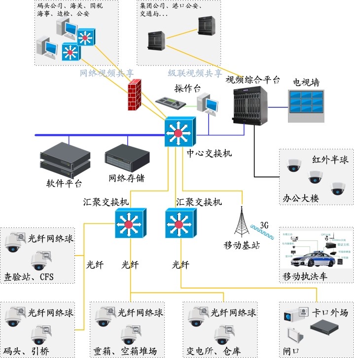 系统将查验站、CFS(集装箱货运站)、码头、引桥、重箱/空箱堆场、变电所、仓库等室外IP监控点(或高清监控点)、办公大楼模拟监控点、闸口高清抓拍监控点、移动执法车监控点接入统一平台。通过视频综合平台实现模拟视频信号、数字视频信号、IP视频信号的统一切换、控制、输出显示、级联共享。支持码头公司、海关、国税、海事、边检、公安等多个交叉部门共享视频资源,并支持统一协调和应急指挥。