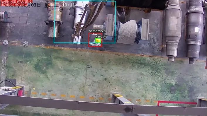 专业团队通过业务逻辑梳理和算法开发评估,最终确定了解决方案,定制开发行车吊钩识别算法:通过在行车两侧安装摄像头,多点位监控行车移动时下发区域是否有人员出入,当行车(摄像头移动导致的整个画面移动)在移动时,人员出现在ROI区域内,则后台告警;当行车(摄像头不移动)不移动时,人员出现在ROI区域内不告警。该算法设计方案通过移动俯瞰视角,能有效识别画面(行车)是否在移动,减少遮挡和透视角度的干扰,保证人员能被清晰识别。