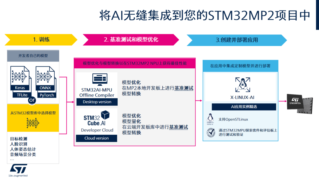 AI应用生态**:**ST提供丰富的生态工具和软件,通过 模型 训练、基准测试和模型优化、创建并部署应用三个阶段,支持用户将AI方案无缝集成到STM32MP2项目中。